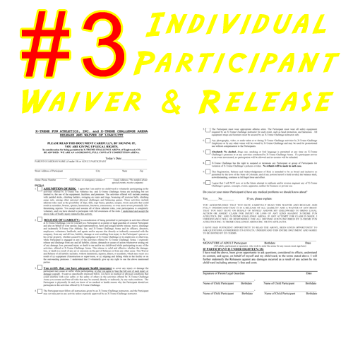 The Waiver Release form must be signed by the child participant's LEGAL GUARDIAN ONLY. NOTE: Other adults are NOT allowed to sign for children for whom they are not a legal guardian. Legal guardian proof, may need to be presented, at Xtreme Challenges discretion/request. NO exceptions will be made for participants who do not have a form. Xtreme Challenge reserves the right to refuse admittance, for incomplete, or improperly filled out, and/or suspicially forged forms. To ensure that each guest brings a form, please print and include a clearly printed two-sided form with your invitations. Participants who arrive without their parentally COMPLETED and SIGNED waiver form will NOT be allowed to participate. Additionally, if any of the boxes are not initialed, or any part of the waiver is crossed out or modified, that participant's waiver will be considered invalid to participate. Please emphasize these WAIVER requirements to each of your guests’ parents via email or verbal REMINDER. We find many guests car-pool with other guests, and therefore don't have forms from THEIR PARENTS to participate.